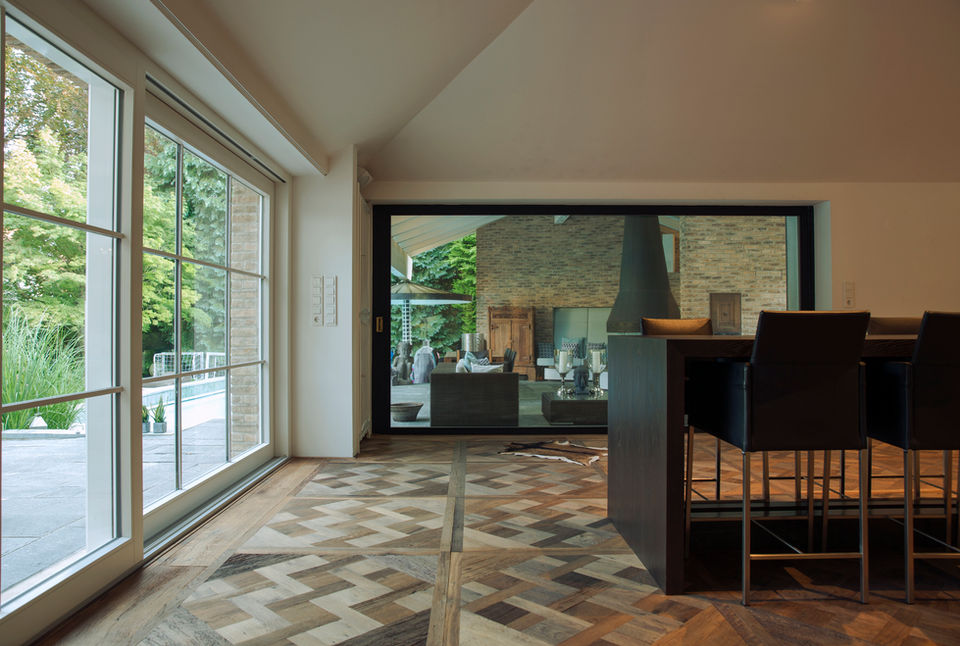 Uns ist es trotz großer Eingriffe, wie zum Beispiel der Umfunktionierung der vorhandenen Garage in den neuen Küchentrakt, gelungen, die Villa als eine bereits vorhandene Substanz erscheinen zu lassen.